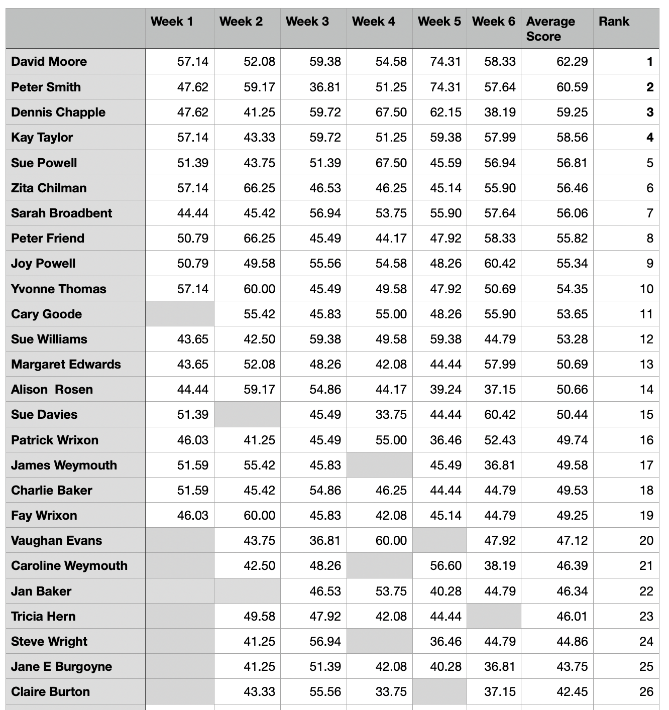 Players must play at least four matches. The best four scores count towards the six week average. The player with highest average score wins.