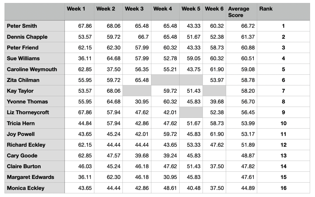 Change Partners 2024 10/01/2024 By adminJW Players have played at least four matches. The best four scores count towards the six week average. The Table of Results after six weeks. The list includes only players who have played 4 weeks.